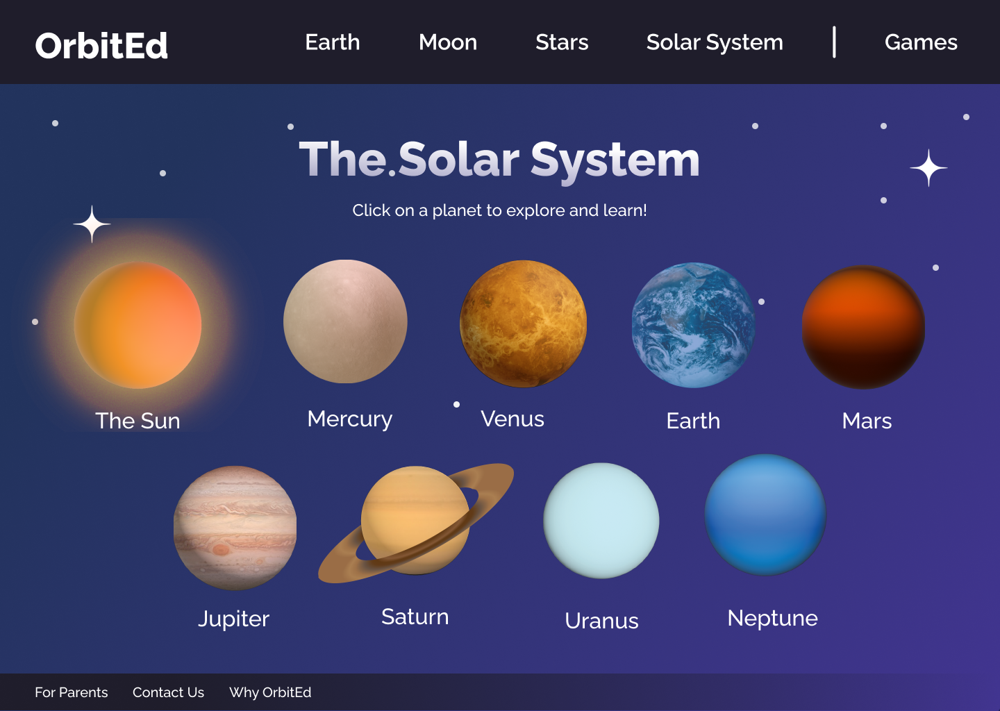 Jonas (Student) – Jonas is a 6th grader who is currently being homeschooled. Jonas has a hard time focusing when visiting the existing sites for planetary education due to their lack of visually appealing and interactive features. He considers himself a text and image-based learner, and being able to retain information is easier for him when he is able to quiz himself in fun and engaging ways.